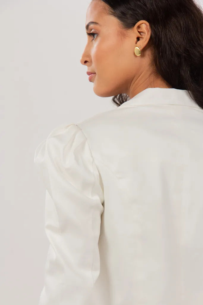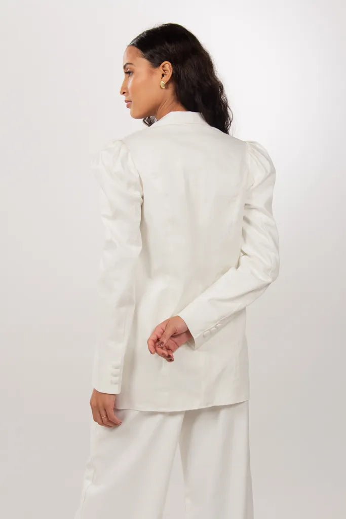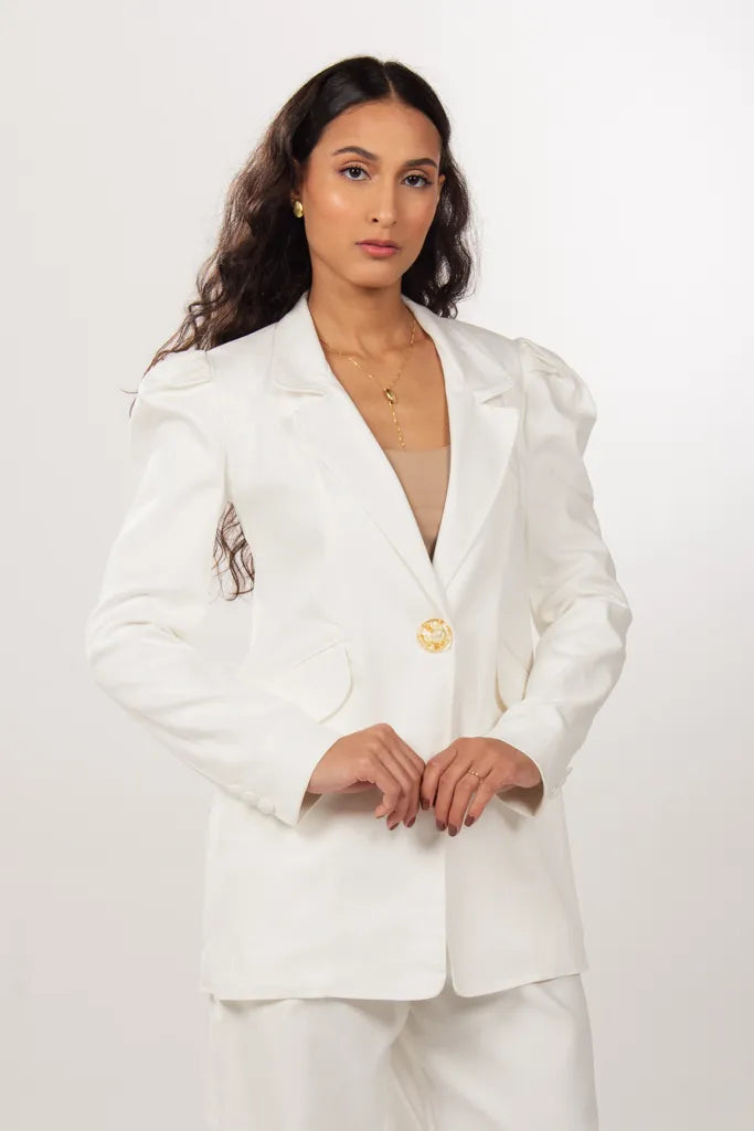 Add a touch of luxury and exclusivity to your wardrobe with our elegant, sophisticated, and handmade white twill blazer. Perfect for special occasions, the handcrafted gold leaf button adds a unique element. Elevate your style with this one-of-a-kind piece.